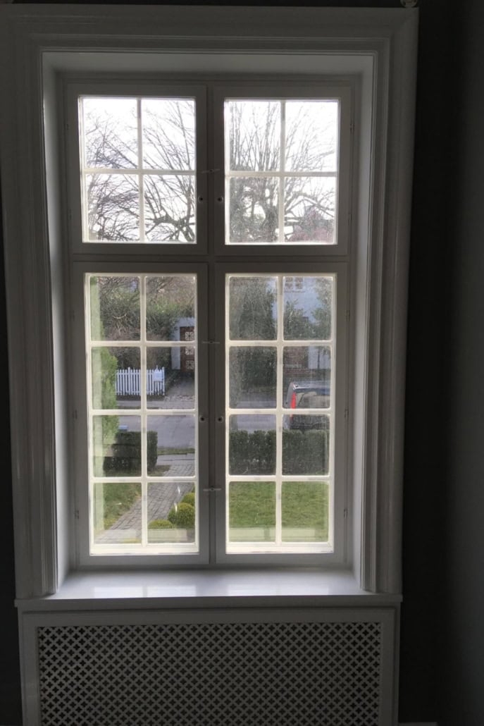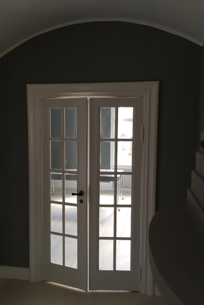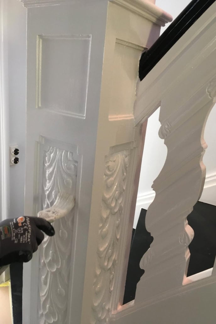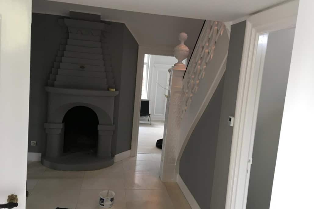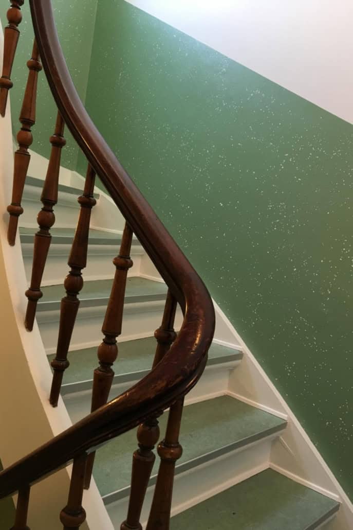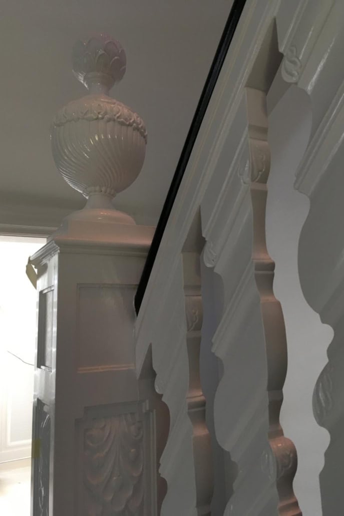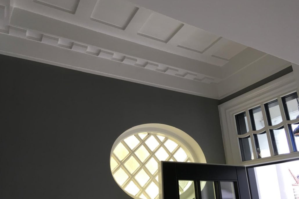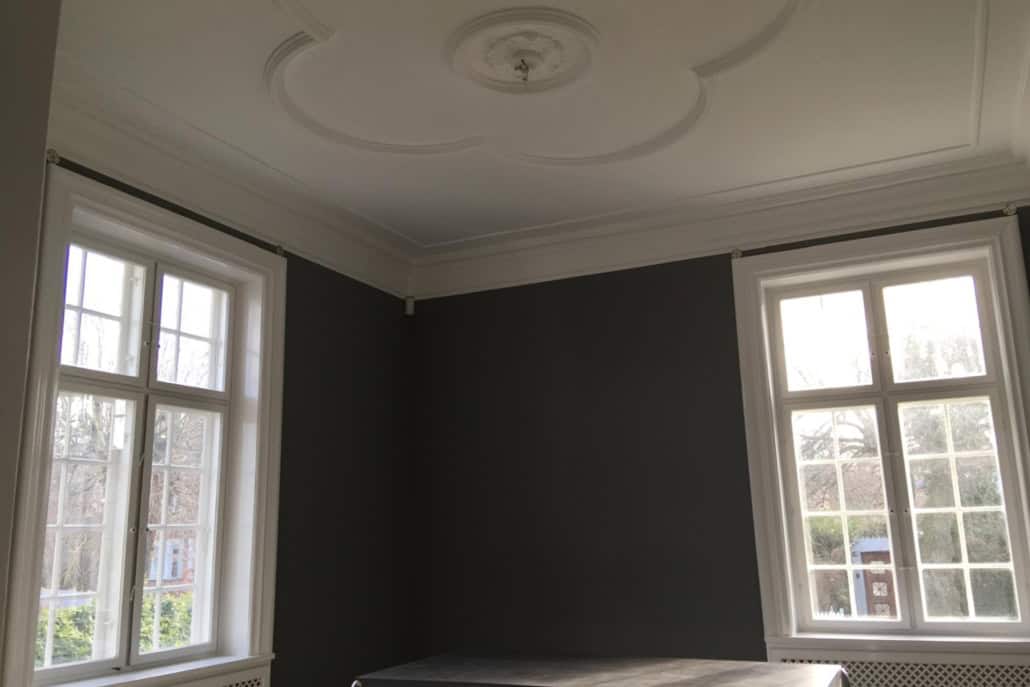 Alt træværk er malet i højglans. Derudover er der malet lofter og vægge samt stuk